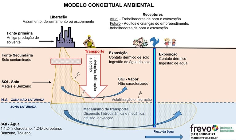 Risco à saúde humana e ao meio ambiente: exposição humana via água, solos ou alimentos cultivados em solos contaminados; impactos ecológicos em aquíferos e ecossistemas subterrâneos.