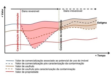 Para compreender a evolução do valor de um imóvel afetado por contaminação, é útil visualizar três fases: