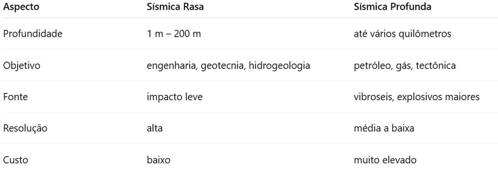 A Tabela abaixa ilustra as principais diferenças entre a sísmica rasa e a profunda: