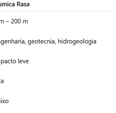 A sísmica rasa é especialmente útil quando se deseja um mapeamento detalhado da zona superficial do subsolo sem interferências invasivas, com rapidez de execução e bom custo-benefício.