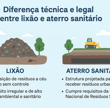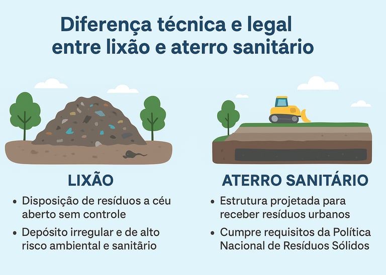 Lixão: disposição a céu aberto de resíduos sólidos sem qualquer engenharia de proteção (sem impermeabilização, sem sistema de drenagem de lixiviado, sem cobertura diária, sem controle de gases nem de vetores). Tecnicamente é um depósito irregular e insalubre; legalmente, configura disposição inadequada proibida pela Política Nacional de Resíduos Sólidos (PNRS).